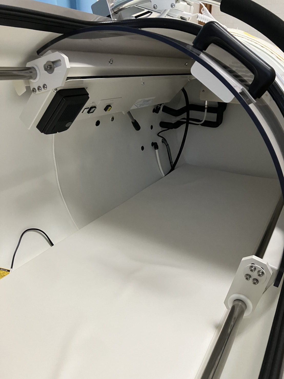 酸素カプセルは構造上、使用中は直ぐに扉が開かない構造になっていますが、手動で排気が可能ですので、約 1~2 分程で外に出ることができます。