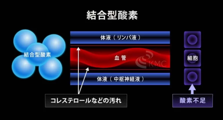 通常の肺呼吸によって取り込まれる酸素は、血液中のヘモグロビン※赤血球と結合して各部位運ばれ そこで消費され「結合型酸素」と呼ばれています。 酸素はサイズが大きい為毛細血管を通り難く、ヘモグロビンの量より多く運ぶことが出来ません。